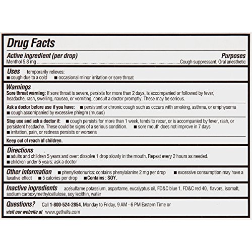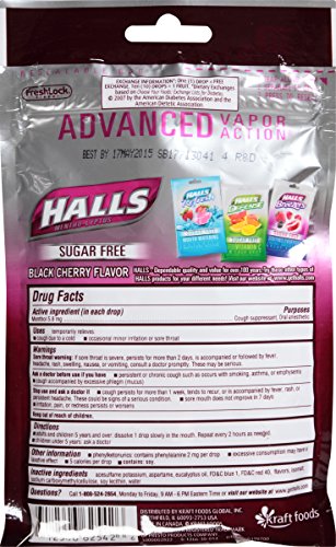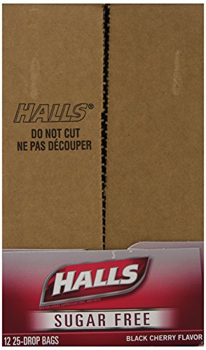 Studio : Halls Publisher : Halls Binding : Grocery Product Description HALLS are formulated with Advanced Vapor Action for fast, effective relief that starts working within 10 seconds. HALLS fights coughs, soothes sore throats, and cools nasal passages. Use the fast-relief of HALLS as a compliment to your allergy medication during allergy season when pollen, grass and trees can trigger irritating coughs and scratchy, sore throats. Enjoy this classic cough suppressant in Sugar-Free Black Cherry flavor. This package includes 12 Packs of 25 drops in flavor-saving resealable bags. 0