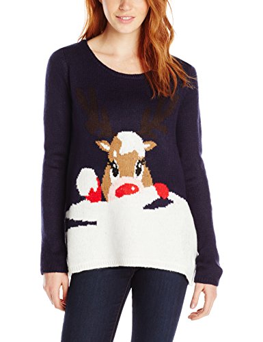 Scoop-neck sweater featuring reindeer peeking over snow and high/low hemline Ribbed trim at cuffs, neck, and hem Brand : Jolt Item model num : JS1123AE7 EAN : 0759880286959 Product Dimensions(LxWxH) :