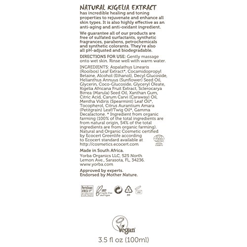 -. Feature : 100% NATURAL FORMULA: This face cleanser has Kigelia Extracts, Marula Oil, and Spearmint Oil that cleanses the face and removes toxins, while leaving your face feeling awake and revitalized / NON-TOXIC,CHEMICAL FREE & GMO-FREE: This all natural face cleanser free of GMOs, parabens, synthetic fragrances, petrochemicals and synthetic colors that could be harmful to your skins' health / CLEANSES AND REFRESHES: This cleanser is full of antioxidants, and super fruits with anti-aging qualities, it is a highly effective daily anti-aging face wash that cleanses, tones and moisturizes / GENTLE & EFFECTIVE: Developed by a team of natural chemists, this refreshing face cleanser uses a potent antibacterial agent that removes dirt and makeup effectively, but is gentle on the skin / CERTIFIED ORGANIC & CRUELTY-FREE: Yorba Organics Face Cleanser is a natural, vegan, gluten and cruelty-free cleanser endorsed and certified by PhytoTrade Africa, The Vegan Society, PETA and Ecocert