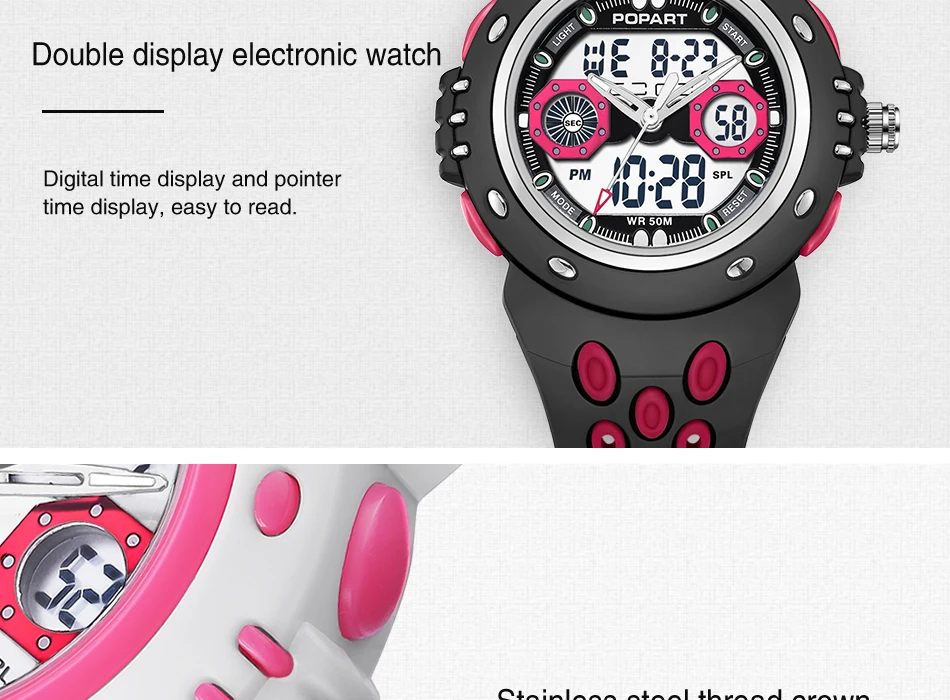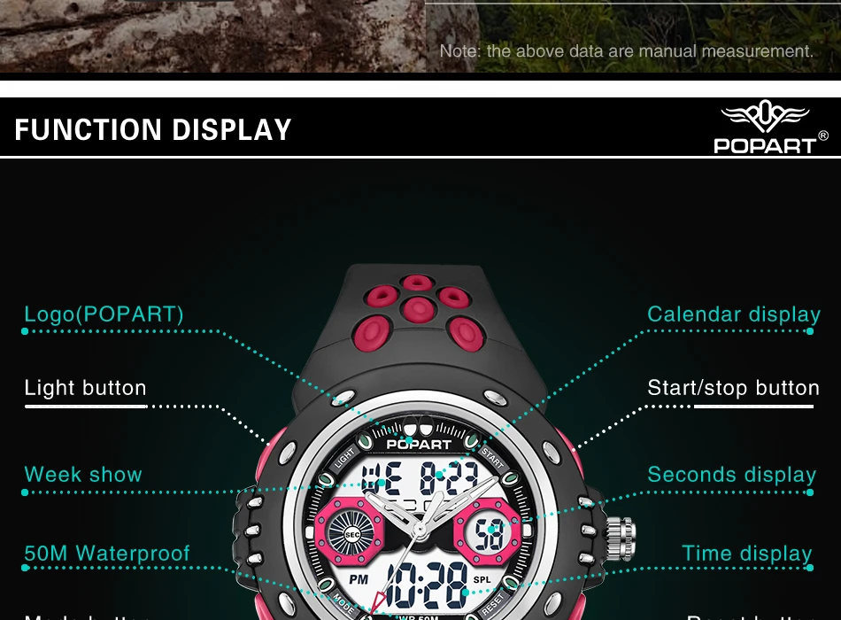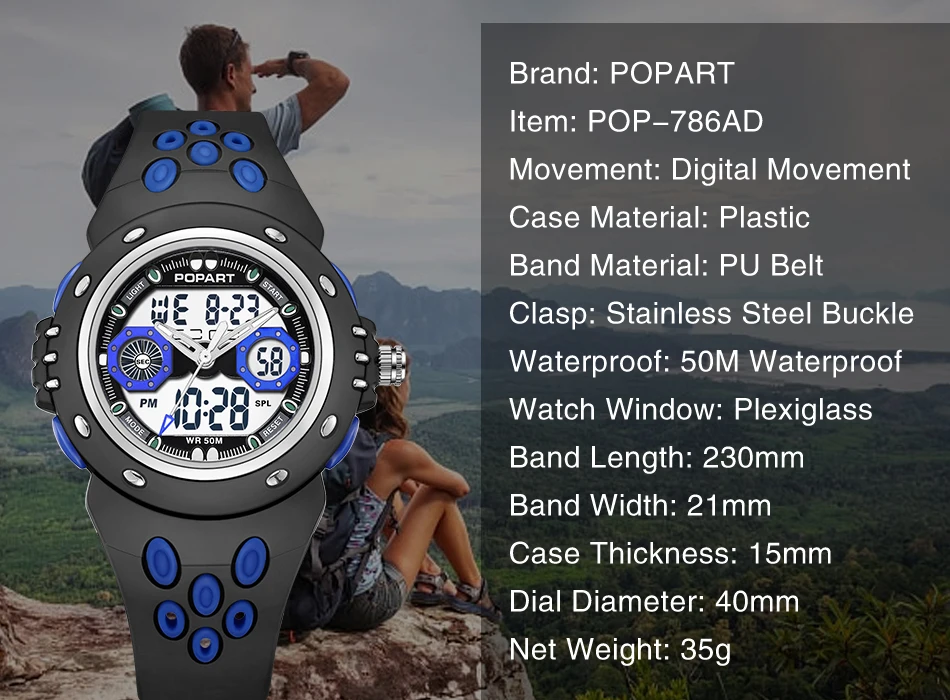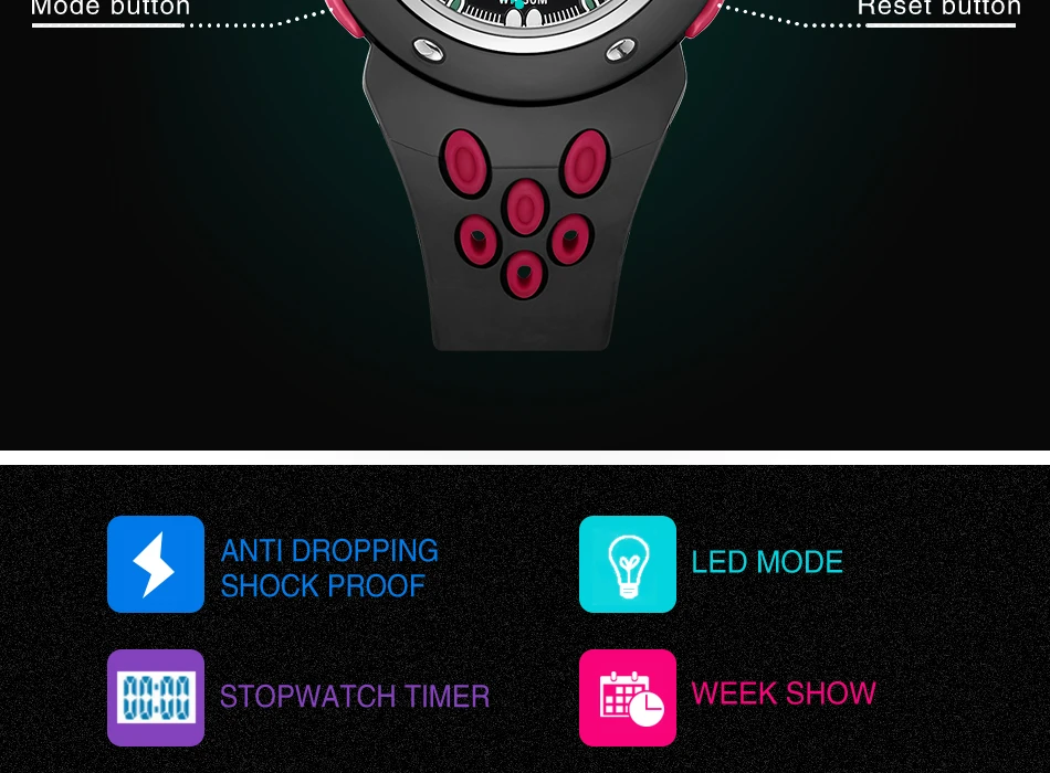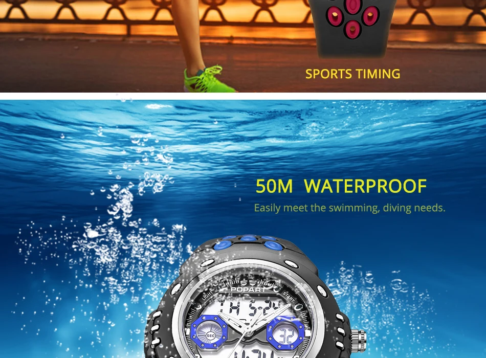 Feature:Water Resistant,LED display,Stop Watch,Auto Date,Back Light,Week Display,Alarm