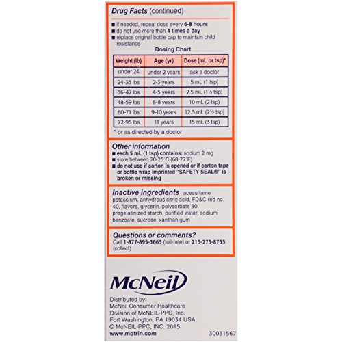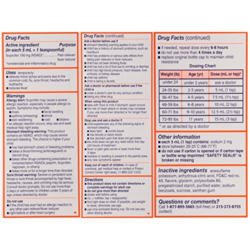 ReleaseDate : 2016-02-03 Studio : Johnson Johnson Consumer Inc. Publisher : Johnson Johnson Consumer Inc. Binding : Health and Beauty Product Description Bring your child fast fever reduction and relief from minor aches and pains with Children's Motrin Oral Suspension. Containing 100 milligrams of ibuprofen per teaspoonful, this product provides up to eight hours of relief from minor aches and pains due to the common cold, flu, sore throat, headache, and toothache. This product is for children ages 2 to 11. 0