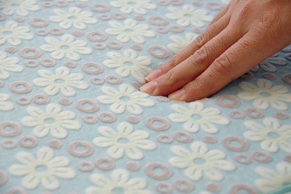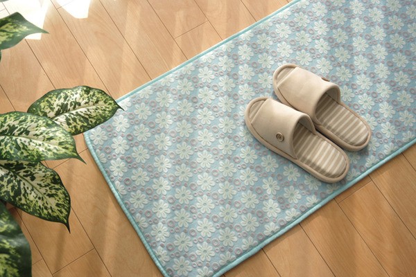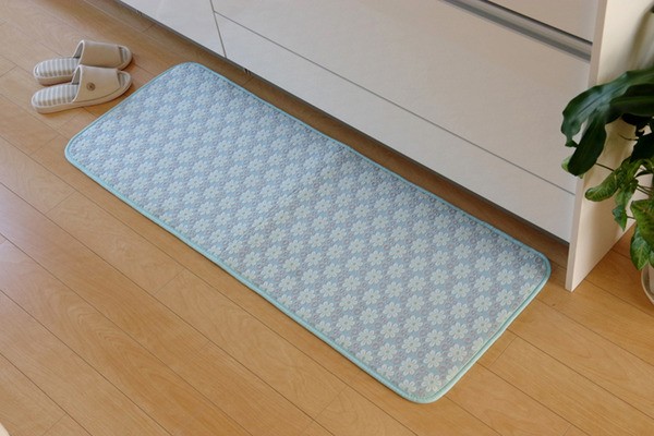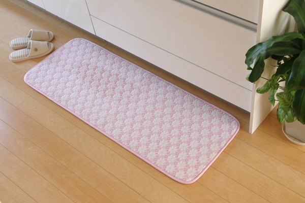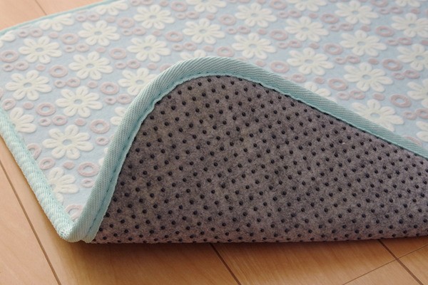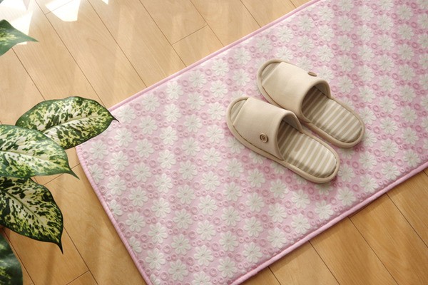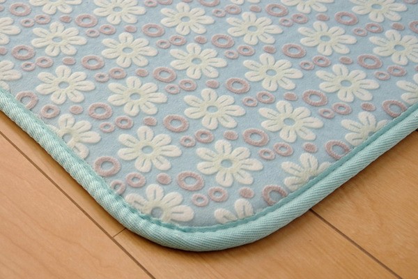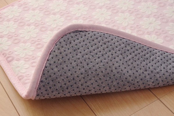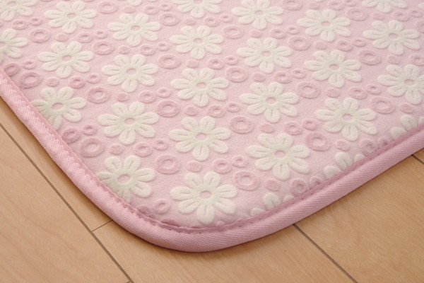 かわいらしい花柄をプリントしたキッチンマットです。表地にはふわっとやわらかな肌触りのフランネルを使用しています。中材には低反発ウレタンフォームを使用しているため足が疲れにくい消費です。裏面にはすべりにくい加工を施しています。