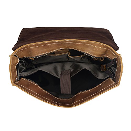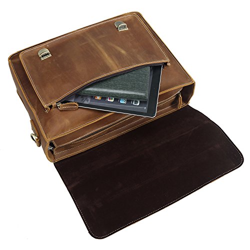 -. Feature : Made of Imported Top Layer Crazy-Horse Cowhide Leather, 100% Brand New & High Quality / Adjustable Padded leather and Braid Shoulder Strap, which is comfortable when carrying heavy objects and may relieve the stress for your shoulder, Top and Durable Hardware / Bag Dimension:15.8(L)*4.7(W)*11.8(H) inch, Net Weight: 4 Pounds / Front flap with push lock while inside pocket has zipper closure, Interior pocket with protection mat is perfect for up to 16" Laptop and A4 magazines; 1 back wall zipper pocket fits iPad Air, Wallet pocket, phone pocket and 3 pen holders inside / The distinguishing feature of crazy-horse leather is that leather may have wrinkles,scratches that are inherent characteristics . When you scrape it widely, the trace will be appeared .If the trace is not obvious, you can wipe it gently and then the trace will be less