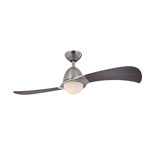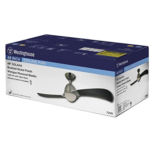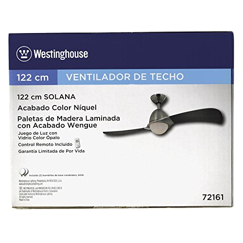 The Westinghouse Solana Indoor Ceiling Fan's clean, cutting-edge look suits modern decor. This fan offers sleek, sophisticated style sure to be the focal point in any room. Brushed nickel finish, integrated opal frosted glass light fixture, and two curved wengue blades complete this design. For added convenience, the Solana includes a remote control allowing you to control your fan with the touch of a finger. This Westinghouse ceiling fan is backed by a lifetime motor warranty and a two-year warranty on all other parts. Product reference number 72161.Feature