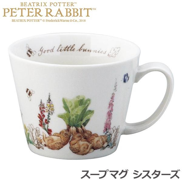 絵本そのままの優しい色合いが素敵なスープマグ。どなたでもお使いいただけるナチュラルな柄です。ご自宅用はもちろん、ギフトにもオススメです。 製造国:日本 素材・材質:磁器 商品サイズ:Φ105×H85mm 重量:320g 仕様:電子レンジ・食洗機使用可容量:400ml ※サプライヤー直送品 ご注文後3~4営業日後の出荷となります【商品名】ピーターラビット(TM) スープマグ シスターズ PR472-36
