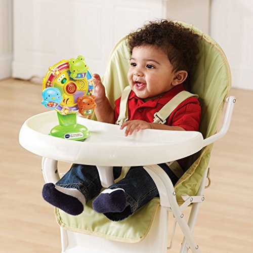 -. Feature : Baby high chair toy is modeled after a Ferris wheel; spinning wheel develops motor skills / Suction cup toy is held in place on smooth surfaces and makes it easier to spin; infant learning toy is perfect for the hard floor, table, or high chair / Baby toy features 5 sing-along songs and over 45+ sounds and phrases that encourage first words / Cute animal buttons on the suction toy teach numbers, colors, and animals; light-up stars flash along with voice and music / Infant toy is intended for babies 3 month to 2 years of age; spinning wheel has 2 AAA batteries included for demo, use new batteries for regular use