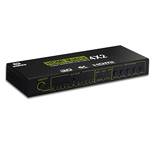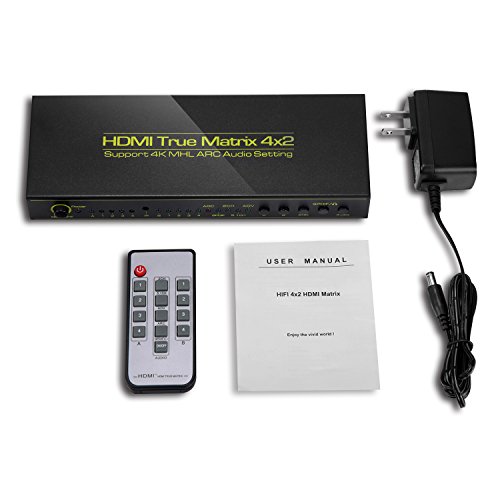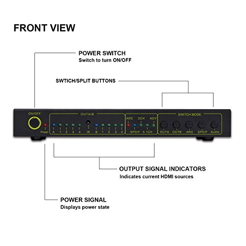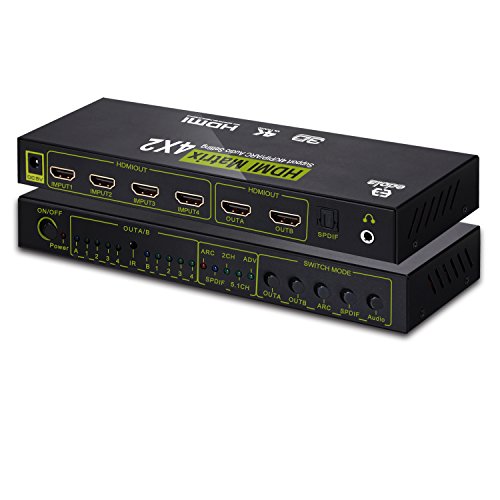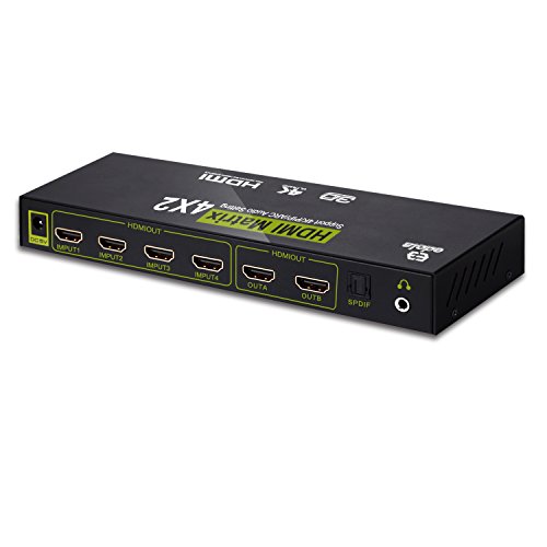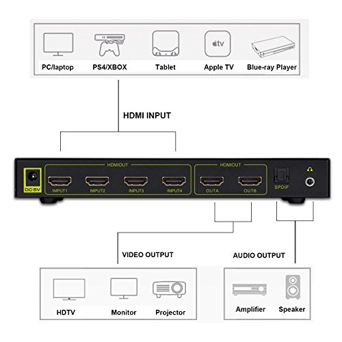 【Large Matrix 4x2 HDMI Splitter】Can switch or split four HD sources to two HD displays, or amplified audio ouput. Audio signal can be extracted and output by the SPDIF Toslink or 3.5mm Headphone audio output port.