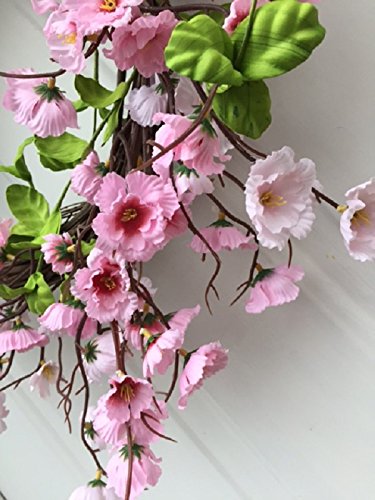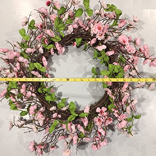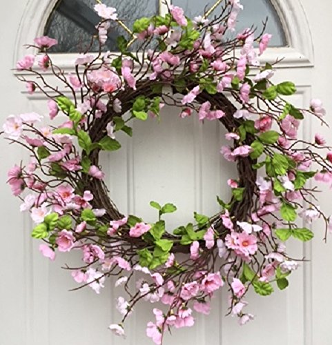 - FRONT DOOR WREATH COMES WITH DOOR WREATH HANGER - Welcome friends and family with this beautiful Spring or Summer Door Wreath. Handmade on a sturdy grapevine wreath base and filled with pretty silk artificial pink cherry blossoms.