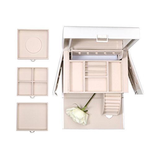 - Divided Multifunctional Compartments: 3 layers with numbers of compartments to organize almost of your jewelries. Including 1 compartment with 14 slots for rings, 4 compartments for earrings, 4 large compartments to put some necklace or other large jewelries and watches, big compartment with 1 cushions special for watches and so on