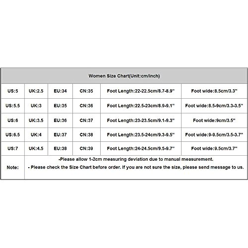 Women Size Chart(Unit:cm/inch) US:5 UK:2.5 EU:34 CN:35 Foot Length:22-22.5cm/8.7-8.9" Foot wide:8.5cm/3.3" US:5.5 UK:3 EU:35 CN:36 Foot Length:22.5-23cm/8.9-9.1" Foot wide:8.5-9cm/3.3-3.5" US:6 UK:3.5 EU:36 CN:37 Foot Length:23-23.5cm/9.1-9.3" Foot wide:9cm/3.5" US:6.5 UK:4 EU:37 CN:38 Foot Length:23.5-24cm/9.3-9.5" Foot wide:9-9.5cm/3.5-3.7" US:7 UK:4.5 EU:38 CN:39 Foot Length:24-24.5cm/9.5-9.7" Foot wide:9.5cm/3.7" 0
