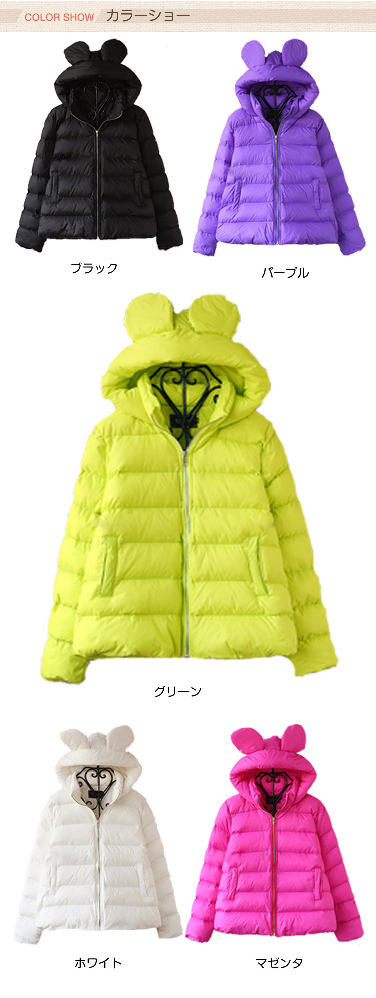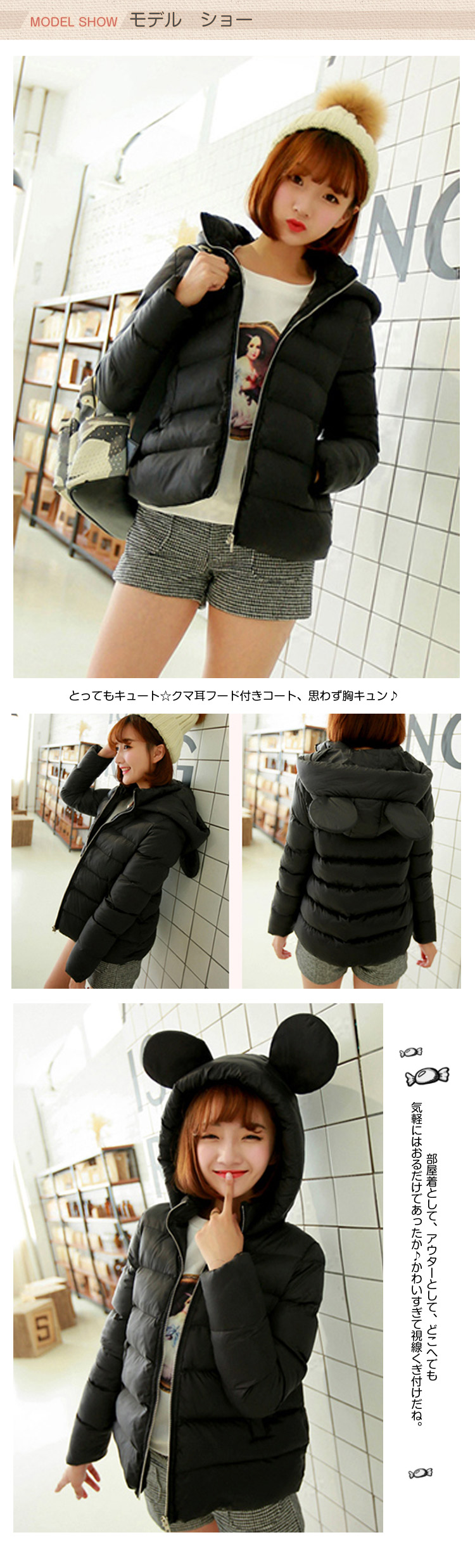 | とってもキュート☆クマ耳フード付きコート、思わず胸キュン?かわいらしいコーディネートで女の子の魅力を引き出します。フロントジップアップタイプだから簡単に脱ぎ着ができて楽チン。カジュアルなので誰でも似合いますよ☆部屋着として、アウターとして、どこへでも気軽にはおるだけであったか?かわいすぎて視線くぎ付けだね。 | |