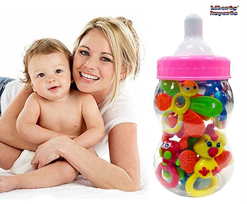 9 Piece Baby Rattle and Teether Toy Gift Set for Girls in Storage Milk Bottle (Pink)