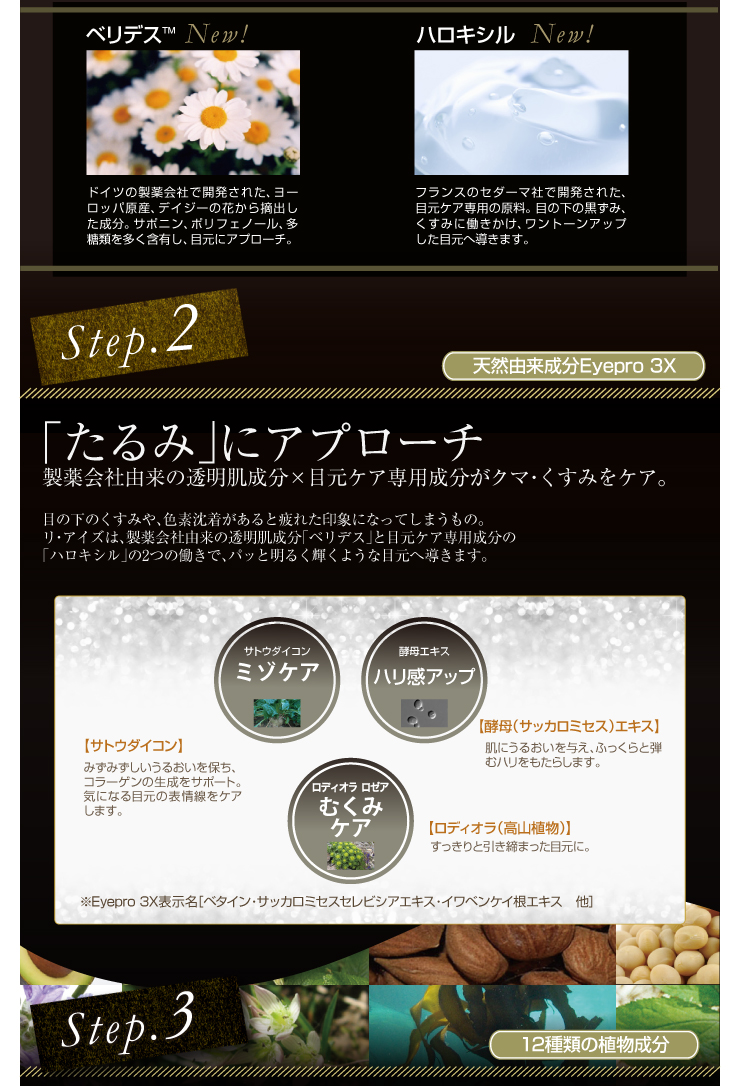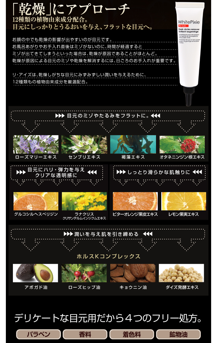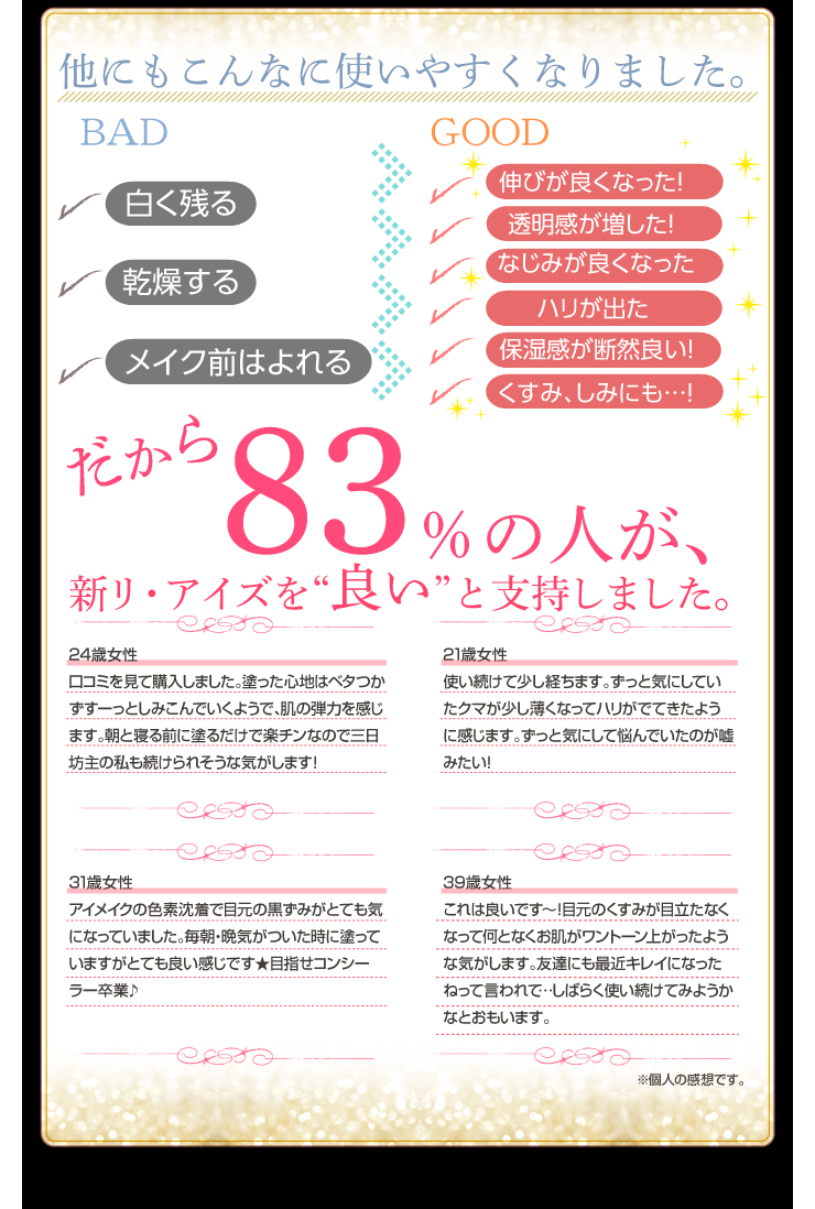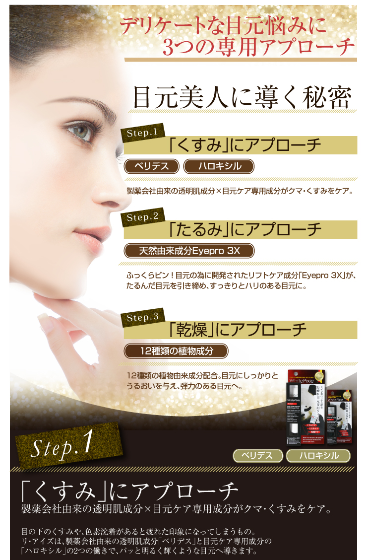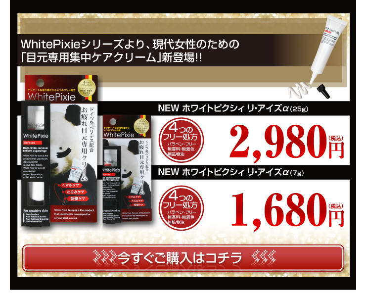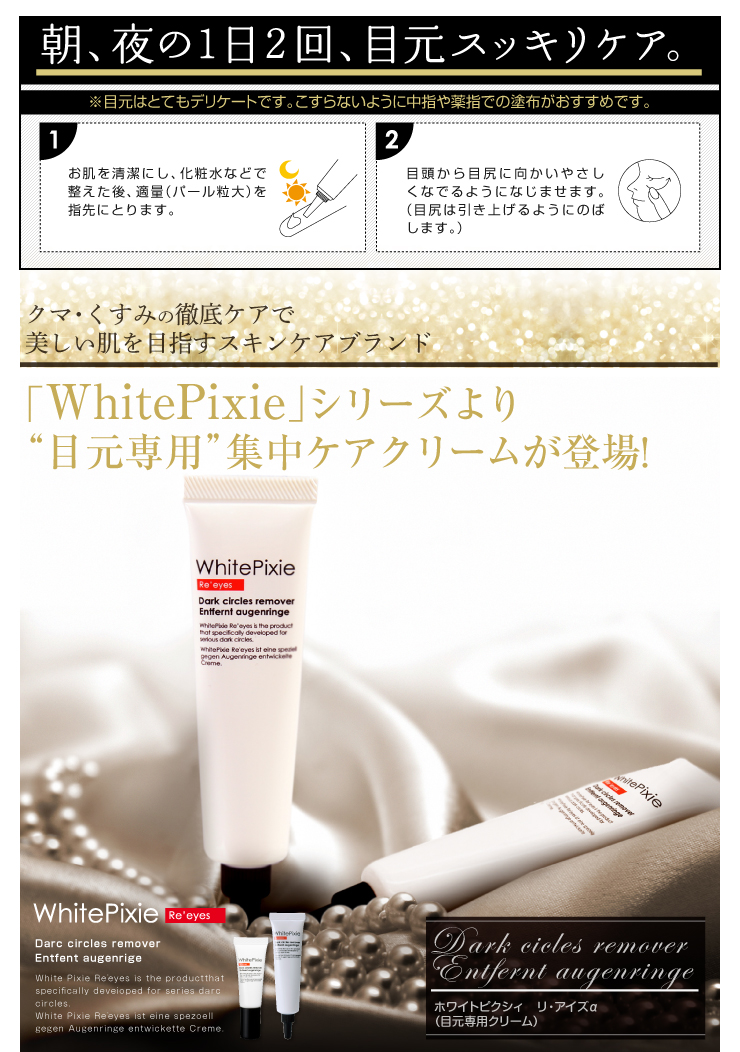 化粧水などで肌を整えた後,適量(パール粒大)を指先にとり,目頭から,目尻に向かいやさしくなでるようになじませます。
