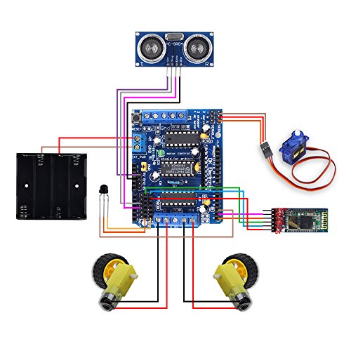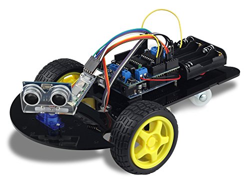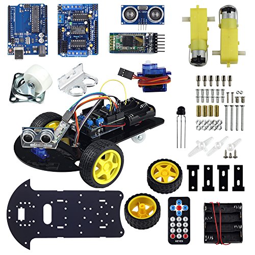 The Kits consist of an UNO R3 board, a HC-SR04 Ultrasonic Sensor and holder, a L293D Motor Driver shield, a 9g micro servo motor and a set of 2WD Driver Motor Chassis Kits, a HC-05 Bluetooth Serial Transmission Wireless Module and an Infrared IR Wireless Remote Controller and IR receiver