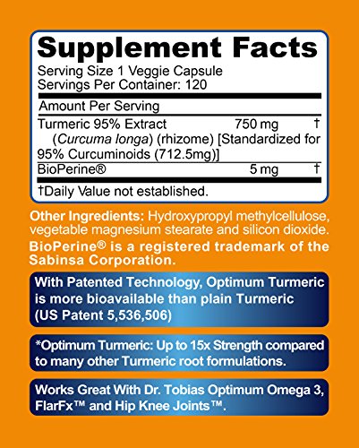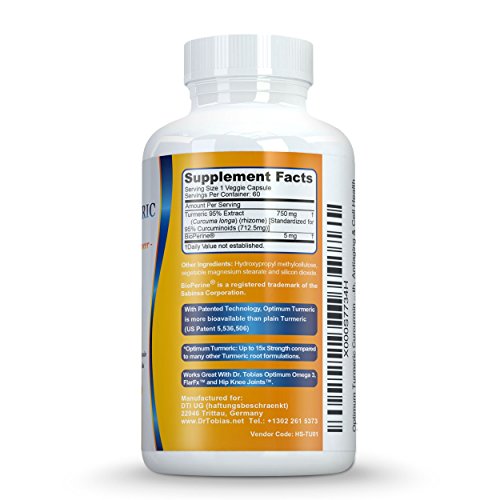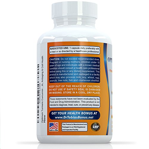 -. Binding : Health and Beauty -. Feature : 15x STRENGTH CAPSULES: Many brands use cheap Turmeric extract that is not standardized or only add 50mg of the 95% extract in. With each of our capsules, you will receive the full health benefits of 750mg Turmeric extract that is standardized to 95% Curcuminoids. Isn't it time to discover the difference that comes from 100% quality and 15x strength capsules / WITH PATENTED TECHNOLOGY, OPTIMUM TURMERIC IS MORE BIOAVAILABLE THAN PLAIN TURMERIC PRODUCTS. We use the patented Bioavailability Booster Bioperine® to aid absorption and make you feel good when taking this product. / KEY HEALTH BENEFIT: Turmeric Curcumin is considered a powerful anti-inflammatory and antioxidant support. It supports healthy joints, antiaging, and cell health.* / BEST VALUE: FOUR MONTHS SUPPLY (120 VEGETARIAN CAPSULES). Smart purchasing made easy - Dr. Tobias 15x strength capsules for the best price lasting long / QUALITY MADE IN THE USA, according to cGMP stardards. Use with pride and confidence. -. PackageQuantity : 1 -. ProductGroup : Health and Beauty -. ProductTypeName : HEALTH_PERSONAL_CARE -. Title : Dr. Tobias Turmeric Curcurmin - 15x Strength: 750 mg per Capsule of 95% Curcuminoids Plus Bioperine