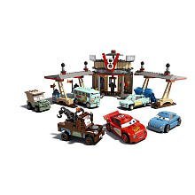 -. Feature : 21.26 in L x 11.1 in W x 3.09 in H / 517 Pieces / Includes Radiator SP.R.Ings Lightning McQueen, classic Mater, Flo, Fillmore, Sarge and Sally / Features Flo's V8 Café with slammer function, gas stand and carwash / Cars all measure over 3" (7cm) long and 1" (2cm) wide