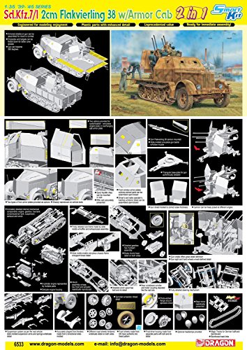 ドラゴン社より、2cm4連装 Flak 38対空機関砲を搭載したSd.Kfz.7/1に装甲キャブが追加された仕様のハーフトラックが発売されます。Flak 38砲を搭載したSd.Kfz.7/1ハーフトラックは1944年10月までドイツ軍によって319台製造されました。1943年後半からは、通常のオープンスタイルのキャブから、キャブを8mm装甲で保護し、対空防御が強化された車輌が製造されました。搭載される機関砲は、側面ボード展開状態で360°旋回可能で、ドイツ空軍対空砲部隊に配備されたこれらの車両は10人で操作しました。キットは2 in 1仕様で、2つの異なる装甲キャブを選択可能です。更に、側面ボードも、木製板を再現したものと、エッチングパーツで正確に金網模様を再現したものの2種類が付属します。側面ボードは起倒し、移動時と戦闘時の表現が可能です。Feature