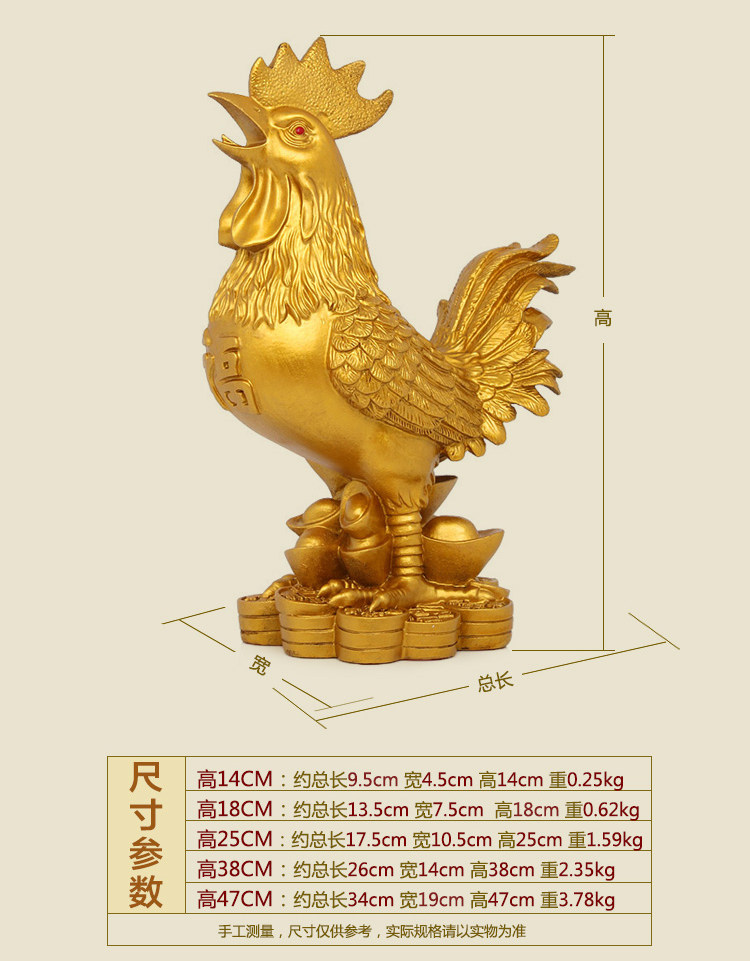 产品相关介绍: 名称:福字鸡摆件 材质:树脂 尺寸:约高14CM长9.5cm 宽4.5cm 高14cm 高18CM长13.5cm 宽7.5cm 高18cm 高25CM长17.5cm 宽10.5cm 高25cm 高38CM长26cm 宽14cm 高38cm 高47CM长34cm 宽19cm 高47cm 重量:约高14CM净重0.25kg 高18CM净重0.62kg 高25CM净重1.59kg 高38CM净重2.35kg 高47CM净重3.78kg |