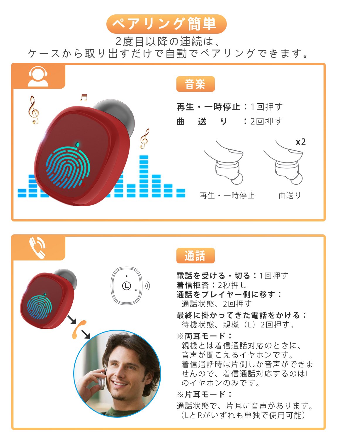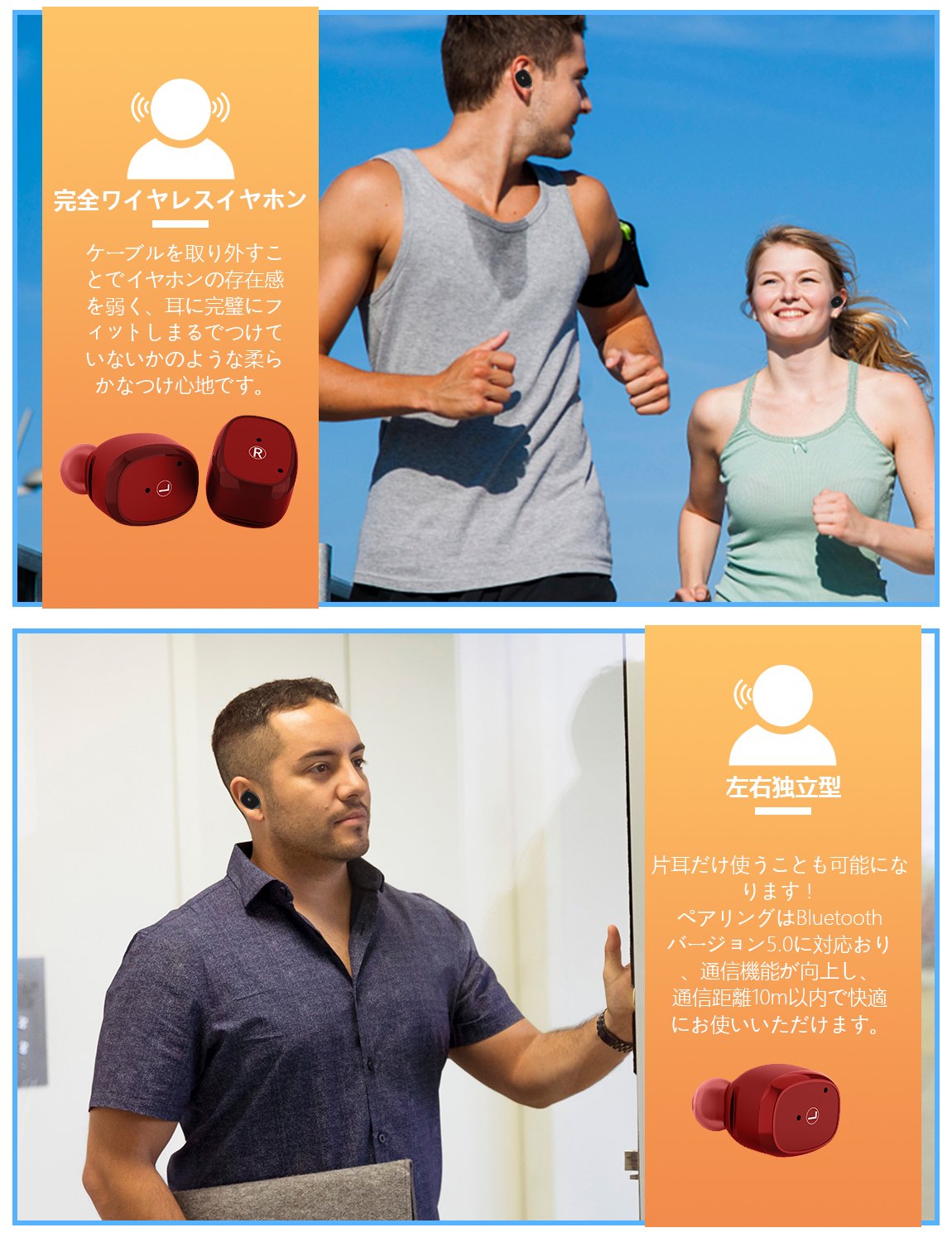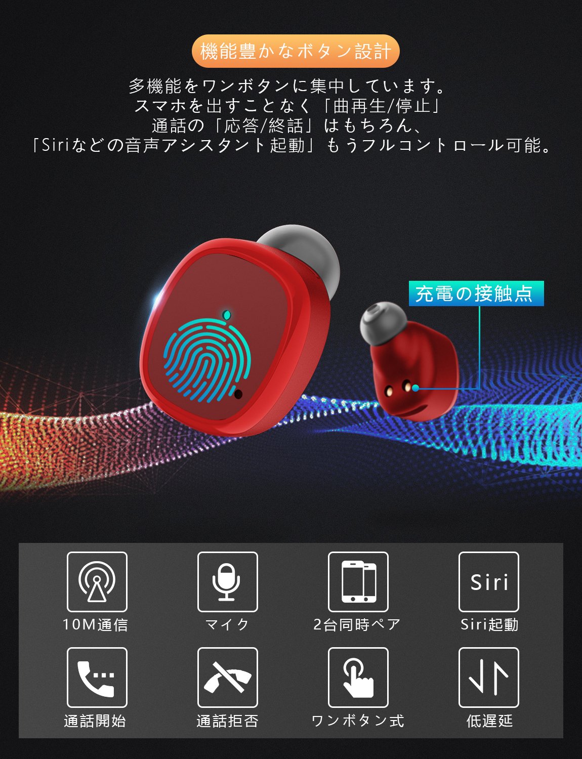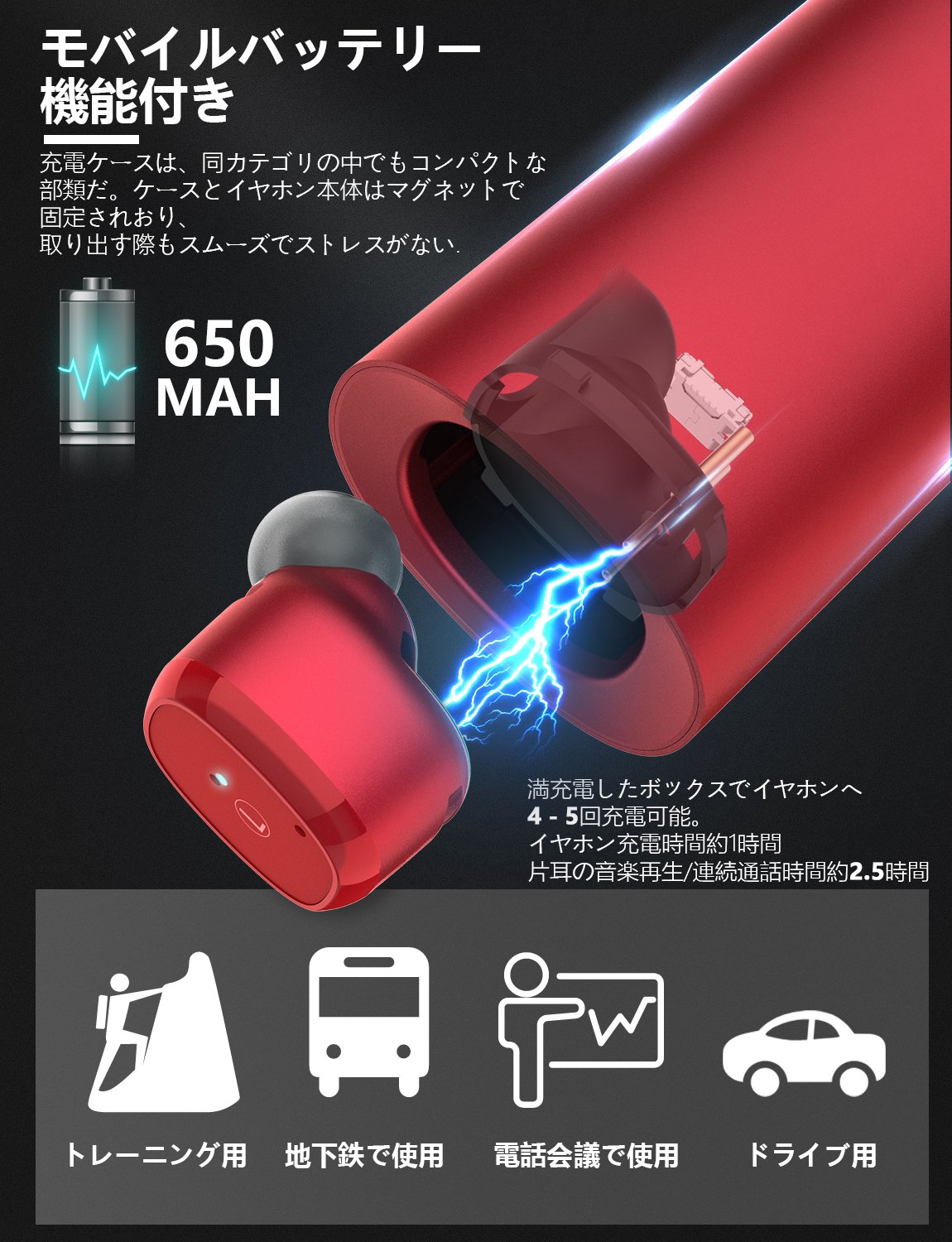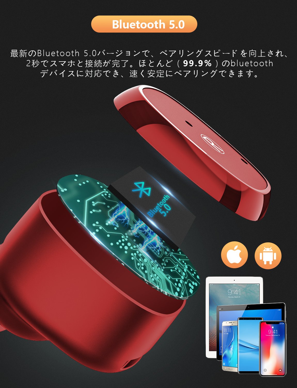 完全ワイヤレス イヤホン Bluetooth イヤホン Bluetooth 5.0 IPX5 ブルートゥース イヤホン 自動ペアリング 防水&防汗 片耳&両耳とも対応 マイク内蔵 Siri対応 収納ケース付 iPhone Android 対応 (レッド)