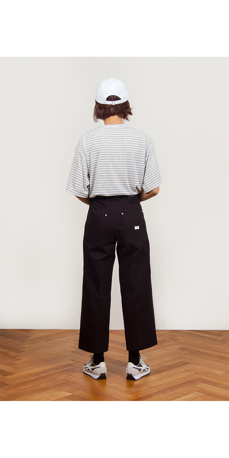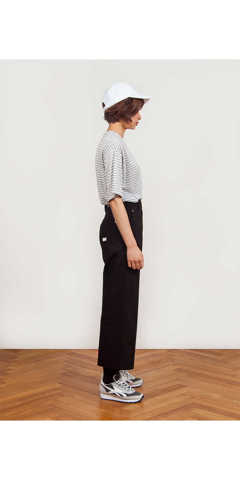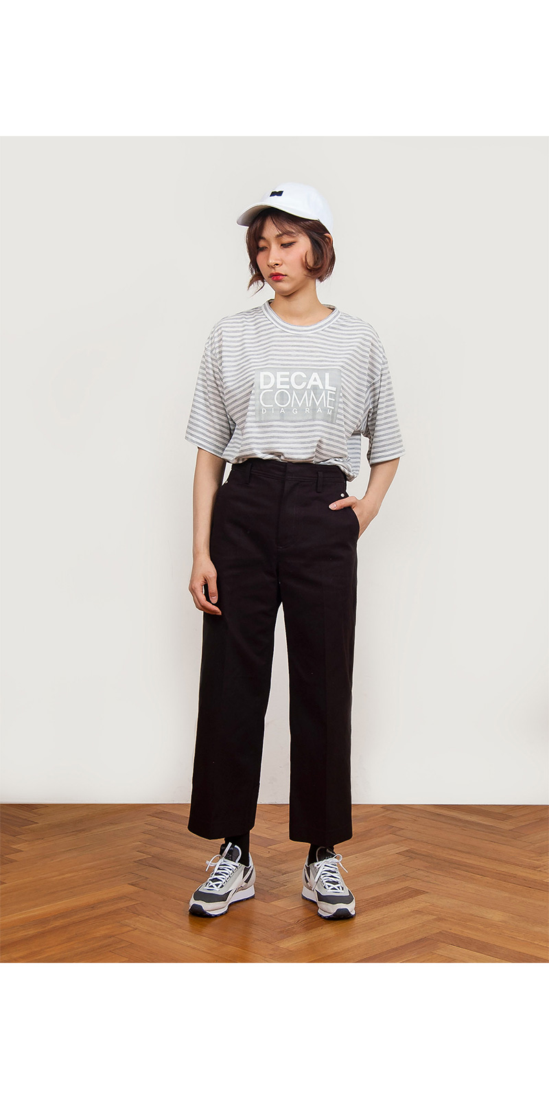 어깨가 살짝 드롭되는 라인의 품감이 100이 조금 넘는 사이즈의 티셔츠 입니다.스트라이프의 베이스 원단에 브랜드 로고가 프린트 되어져 있으며,하의에 넣어서 연출하거나 빼내어 연출할 수 있도록 총장을 70cm 엉덩이를 살짝덥는 기장으로 디자인 하였습니다.