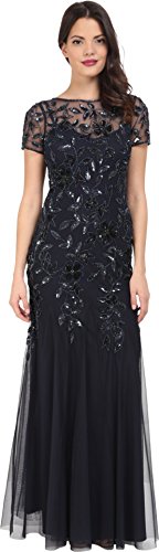 Short-sleeve gown featuring beaded flowers at bodice and un-beaded skirt with self-godets between pleats