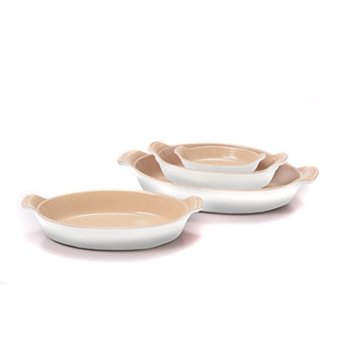 Studio : Le Creuset Publisher : Le Creuset Product Description Treat yourself to something delicious with this four piece nested set of Le Creuset au gratin dishes. These incredibly versatile cast stoneware pieces are perfect for all of your needs, from baking to serving and even storing. Each cookware piece is fired at 2156 degrees Fahrenheit, making them virtually nonporous so they don't absorb flavors, odors, or moisture. The enameled surface also makes them incredibly resistant to scratches, chipping, and staining. The Heritage style flared handles allow for safe maneuvering directly from oven to table. Perfect for individual servings, these unique little dishes offer huge possibilities. Serve up some snacks, appetizers, or your very own creme brulee, and enjoy the easy clean-up when you're through. Suitable for use in the oven up to 500 degrees Fahrenheit, these dishes can be broiled or baked. Backed by a five year manufacturer's warranty, they are also dishwasher safe for easy cleanup and nested for compact storage. 1.7 quart au gratin -- 8" L x 14" W x 2-1/2" H; 1 quart au gratin -- 9-1/2" L x 6-1/4" W x 2-1/2" H; 24 ounce au gratin -- 8" L x 5-3/4" W x 1-1/4" H; 6 ounce au gratin -- 5-1/4" L x 4" L x 1" H 0