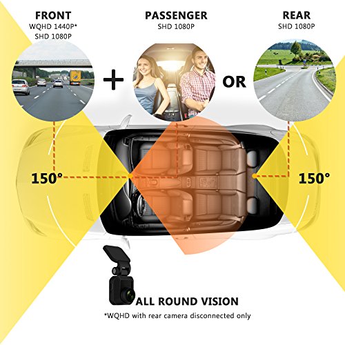 DUAL SUPER HD RECORDING: Never miss a license plate in Super HD 1920x1080P at 30FPS for front camera and rear view camera - ultra wide 150-degree viewing angle captures more of the road around you - built-in 450mAh battery enables 30mins recording without power input - record in stunning WQHD 2560x1440P at 30FPS with rear camera disconnected - features 2.4-inch scratch resistant LCD display screen with PiP display