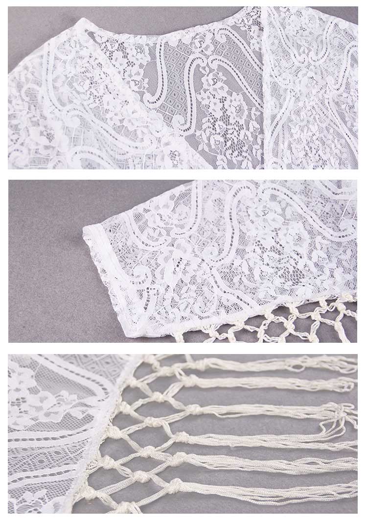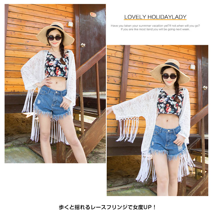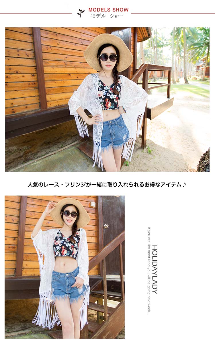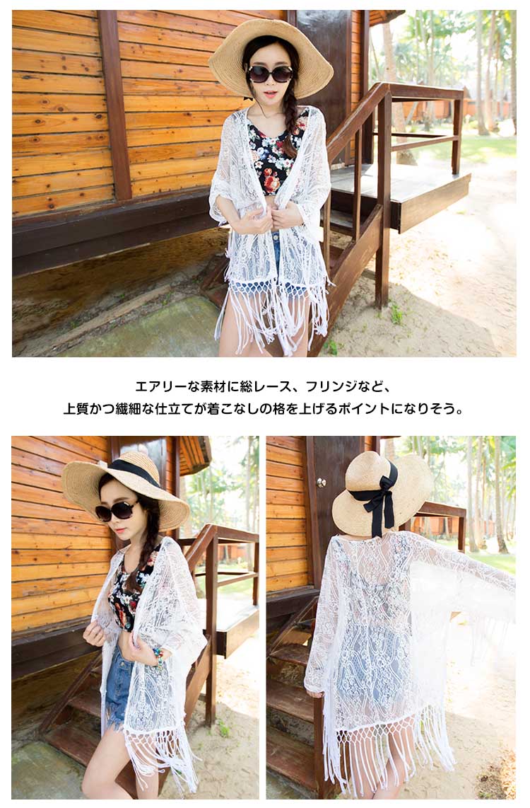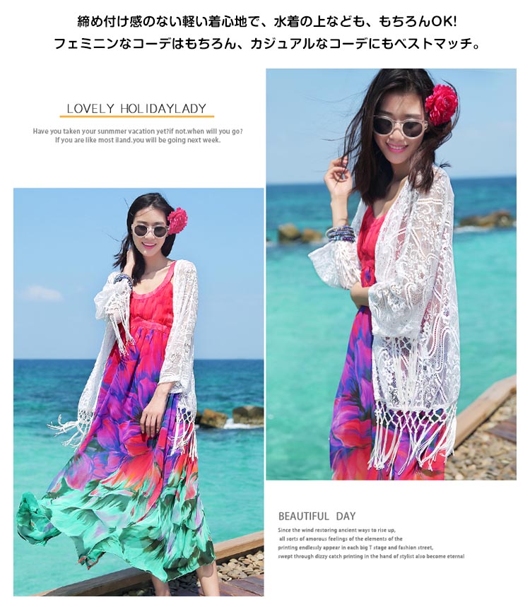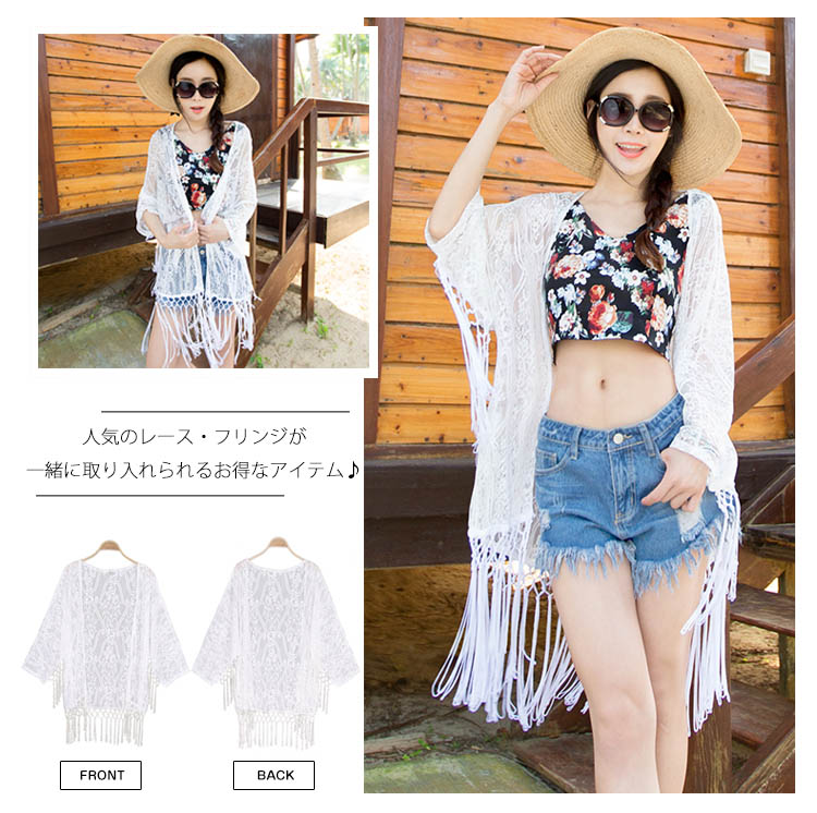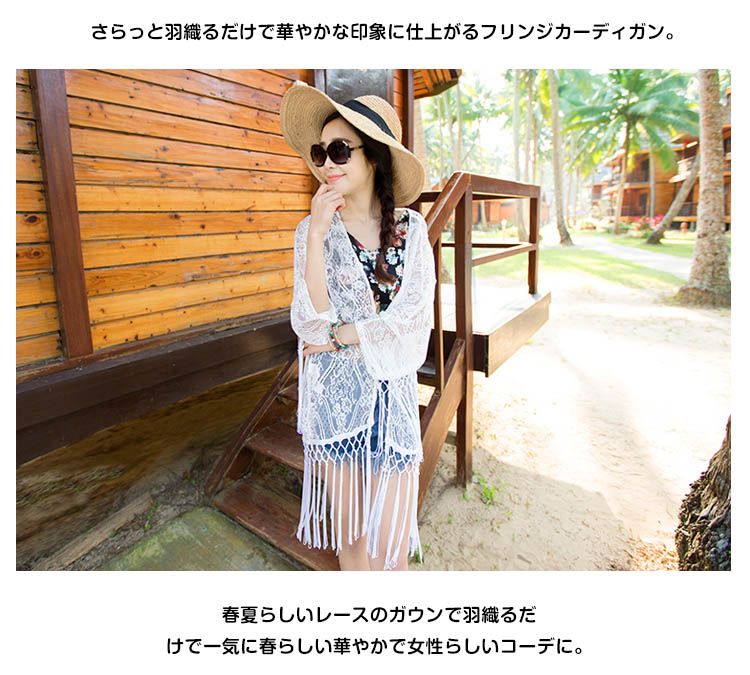 | 人気のレース・フリンジが一緒に取り入れられるお得なアイテム♪さらっと羽織るだけで華やかな印象に仕上がるフリンジカーディガン。春夏らしいレースのガウンで羽織るだけで一気に春らしい華やかで女性らしいコーデに。歩くと揺れるレースフリンジで女度UP!エアリーな素材に総レース、フリンジなど、上質かつ繊細な仕立てが着こなしの格を上げるポイントになりそう。 締め付け感のない軽い着心地で、水着の上なども、もちろんOK! フェミニンなコーデはもちろん、カジュアルなコーデにもベストマッチ。 | |
