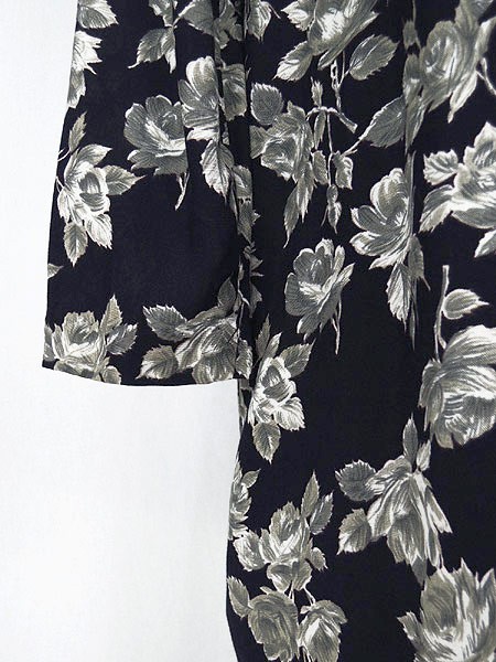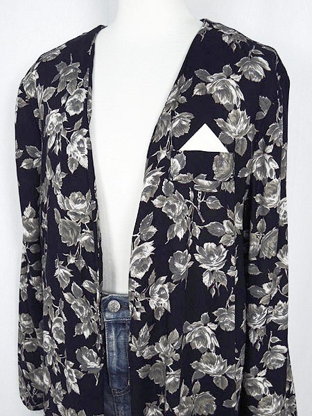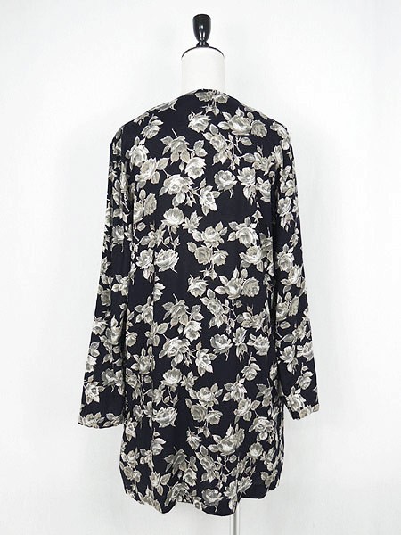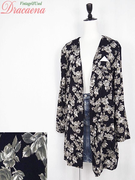 Ladies ブランド- カラー黒ベース メール便不可 コンディション★★★ 素材レーヨン 表記サイズ- 実寸サイズ 着丈 86.5 cm 身幅 56 cm 肩幅 38.5 cm 袖丈 58 cm ※ウエスト・ヒップ以外は平置き採寸
