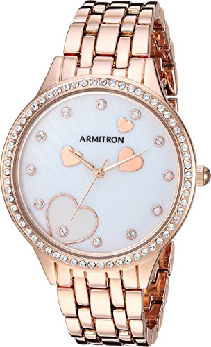 Bezel set with 62 clear Swarovski crystals; mineral crystal lens; mother-of-pearl dial with heart designs; rose gold-tone hands and Swarovski crystal accented markers