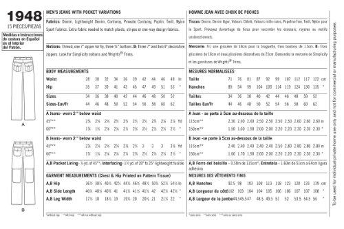 -. Feature : Men's jeans. suedesays collection, size aa (34-36-38-40-42). simplicity pattern 1948 / Instructions are written in english, spanish. / Designed and manufactured in the u.s.a.