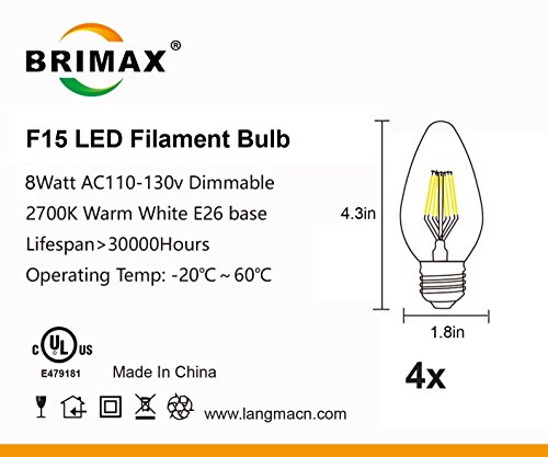 BRIMAX F15 8W Filament Decorative LED Candle Light Bulb, 75W - 80W Incandescent Equivalent, E26 Medium Base Dimmable 2700K Warm White Flame Wrinkle Glass, for Outdoor and Room Decorative Lamp, 4pack