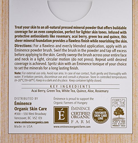 Are you looking for flawless, even coverage that brings out the best in your complexion? Then look no further than Eminence Organics Antioxidant Mineral Foundation. Available in two shades to compliment almost all skin tones, this pressed mineral foundation powder is made of all-natural ingredients, providing build able coverage. in addition to its amazing makeup abilities, Eminence Antioxidant Mineral Foundation has a unique formulation of ingredients that infuses the skin with antioxidants, protecting it from free radical damage. Additional vitamins and minerals further enhance the health and appearance of your complexion. Vanilla cream is perfect for normal to light skin tones, revealing an even, toned complexion. Honey beige is for normal to dark skin, giving a sun-kissed glow. Get flawless coverage with Eminence Organics Antioxidant Mineral Foundation.Feature
