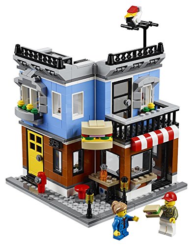 -. Feature : Enthält 2 Minifiguren: einen Mann und ein Mädchen. / Der Feinkostladen an der Ecke besitzt eine detailreiche Fassade mit rot-weiß-gestreifter Markise, 2 Küchendurchreichen und einem baubaren Ladenschild in Form eines Sandwich. Auf der Straße stehen ein Hydrant und 2 Straßenlampen. Im Inneren befinden sich die Registrierkasse und die Treppe zur Wohnung im 2. Stock. Die Wohnung ist mit einem Sessel, einer Lampe und einem Balkon ausgestattet - und von hier führt auch eine Treppe zur Dachterrasse mit der TV-Antenne und einem baubaren Vogel. / Bereite die Sandwiches zu, öffne die Durchreiche und bediene deine hungrigen Gäste. / Zubehör: ein Hocker und zwei baubare Sandwiches.