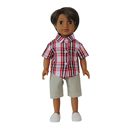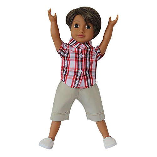 Medium Brown Skin Vinyl Boy Doll 18 Inch With Casual Grid Short Sleeve Shirt, Ligth Green Shorts, White Shoes