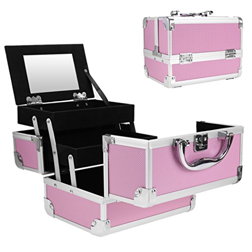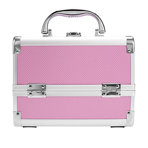 Mini Makeup Train Case with Mirror & 2Trays Jewelry Box Organizer Travel Cosmetic Storage - Chic Gift (Pink)