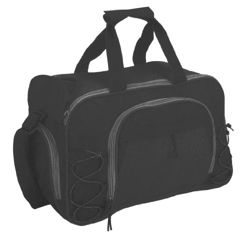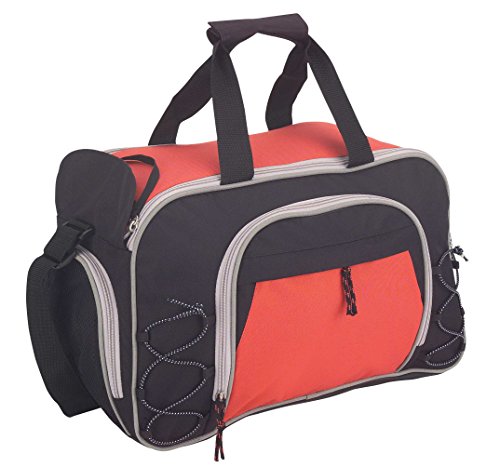 -. Feature : FEATURE: Large zippered & open side pockets w/ elastic holders, mesh & open zippered end pockets, shoe storage, vinyl bottom. / MATERIAL: 600D Polyester. / SIZE: 18" X 11" X 9-1/2" / COLORS: Black, Black/Royal, Black/Red.