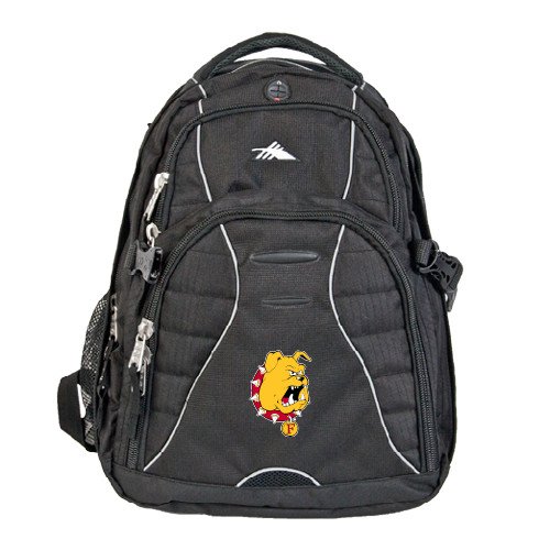 -. Binding : Electronics -. Brand : CollegeFanGear -. Color : Black -. Feature : 600d polycanvas / Embroidered logo / Padded interior computer sleeve (holds a 17 inch laptop), multiple pockets, and key fob. / Media player pocket with headphone port. Valuables pocket for smartphone. Side mesh water bottle pockets. / Dimensions: 19 H x 8.5 W x 13 L -. Label : CollegeFanGear -. Manufacturer : CollegeFanGear -. MPN : 6-72-JF0149 -. PackageQuantity : 1 -. PartNumber : 6-72-JF0149 -. ProductGroup : PC Accessory -. ProductTypeName : CARRYING_CASE_OR_BAG -. Publisher : CollegeFanGear -. Size : One Size -. Studio : CollegeFanGear -. Title : Ferris State High Sierra Swerve Compu Backpack 'Bulldog Head'