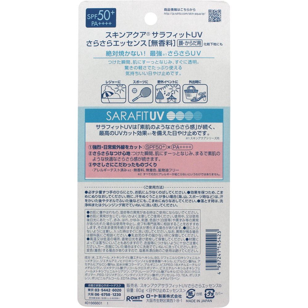 Skin Aqua Sara fit UV silky essence fragrance-free (SPF50 + PA ++++) 80g