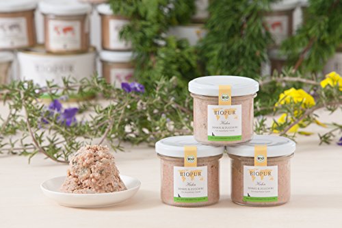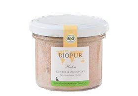原材料:【原材料】Bioスペルト小麦(41%)、Bio鶏肉(27%)、Bioズッキーニ(24%)、Bio鶏レバー、Bioサンフラワーオイル, 【分析値:カロリー140kcal/100g】粗タンパク質 8%、粗脂肪 4%、粗繊維 2%、粗灰分 3%、水分 73%、カルシウム 0.31%、リン 0.19%