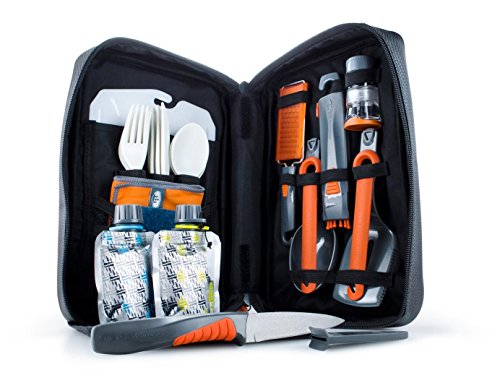 Includes:Mini Cheese GraterCollapsible WhiskPivot SpoonPivot SpatulaUtility Knife12 pc. Cutlery SetSpicer2 Condiment ContainersCutting BoardScrubberCamp TowelBallistic Nylon Case