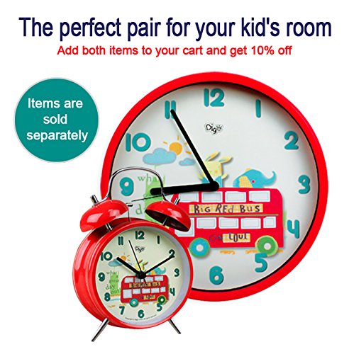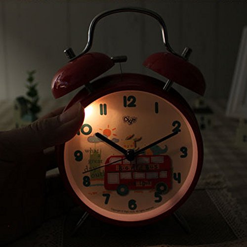 SILENT 4” Children QUIET Alarm Clock for Kids - Twin Bell - Strong Metal Frame –Analog non Ticking Silent Clocks- Comfortably Loud- Battery Operated - Back Light - Child/ Boys/ Girls- Red Bus