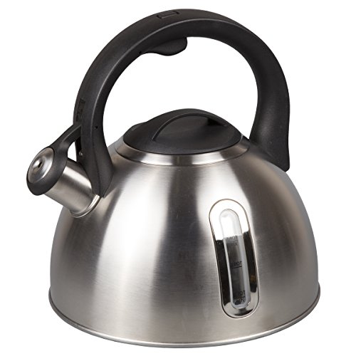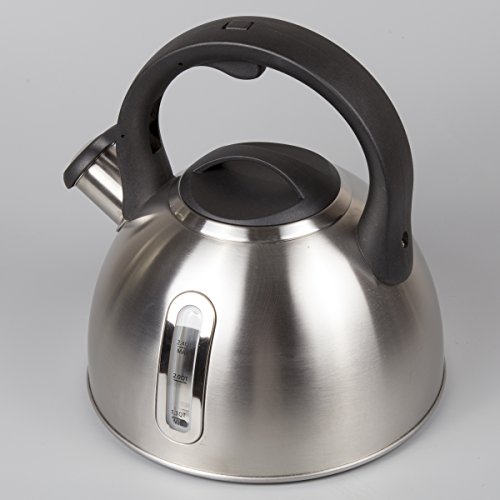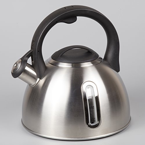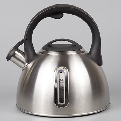 This Creative Home Encore 2.4 qt. High quality stainless steel whistling tea kettle with capsulated bottom is crafted of high quality stainless steel with 2.4 quart (2.3 liter) Capacity. Whistles when boiling, can be used on gas and electric stove tops. Aluminum capsulated bottom to provide even heat distribution. Kettle heats up quick and nob are cool to the touch after boiling. Handle and nob are cool to the touch after boiling. Elegant and stylish design. Moniter water volume via clear window of kettle. Ensure you are boiling the perfect amount of water.Feature