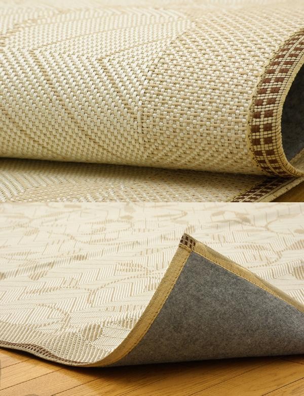 麻の一種であるジュート糸と、ポリエチレン糸のジャガード織のカーペットです。裏面にはフローリングを傷つけにくいよう不織布を貼っています。 |