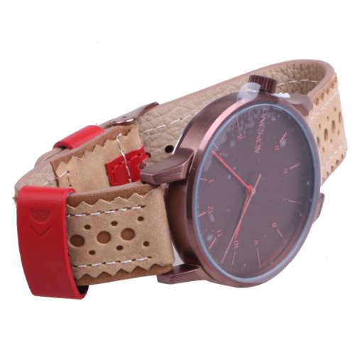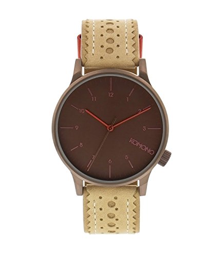 -. Feature : Komono blurs the line between the genders, the classic and the new, design and fashion, and minimalism and color / Water resistant to 30 meters - withstands rain and splashes of water, but not showering or submersion / Soft and supple tan leather band with low-lying buckle perfect for anyone with sensitive wrists / Monochromatic brown dial and numbers allow the orange hands to just pop / Quartz movement for long-lasting accuracy, losing only a few seconds per month