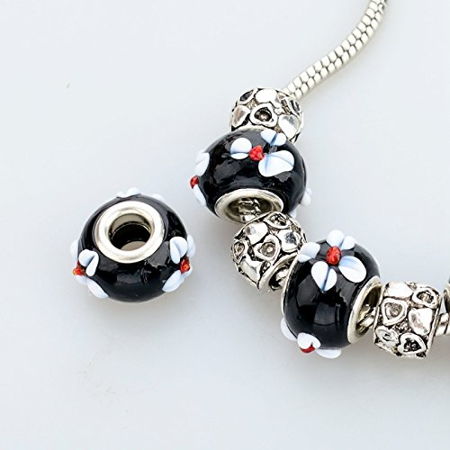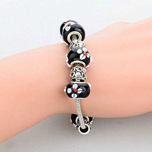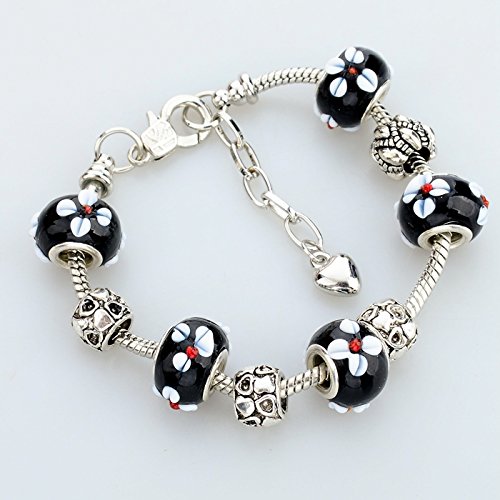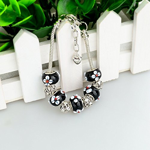 Long Way Women Silver Plated Snake Chain Black Maruno Glass Bead Flower Heart Charm Clasp Bracelet