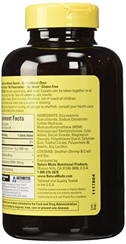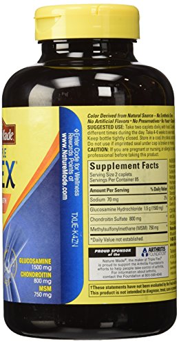 Nature Made TripleFlex contains glucosamine hydrochloride, chondroitin sulfate and MSM. Glucosamine may help maintain the structural integrity of joints by stimulating the production of glycosaminoglycans and proteoglycans, which are two essential building blocks of cartilage. Therefore, glucosamine is an essential component for maintaining healthy joints.* One study showed glucosamine improved knee function.* Chondroitin is a naturally occurring nutrient found in the connective tissues, which lubricate and cushion your joints. Chondroitin is thought to promote water retention in the spaces between the joints filled with synovial fluid. One meta-analysis showed a statistically significant improvement in joint function in those taking chondroitin sulfate.* MSM, or methylsulfonylmethane, is a source of inorganic sulfur for joint cartilage. Because sulfur is essential-for the formation of connective tissue, MSM has been studied for its use in promoting joint comfort.* *These statements have not been evaluated by the Food and Drug Administration. This product is not intended to diagnose, treat, cure or prevent any disease.Feature