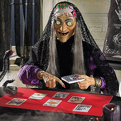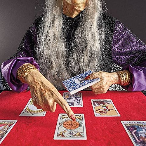-. Brand : Haunted Halloween -. EAN : 0708702577294 -. Feature : Figure features long gray hair and a realistic face and hands Highly detailed costume of quality fabrics Includes complete figure and red felt table mat, imP.R.Inted with card designs Designed to be placed at a standard-height table (not included) Equipped with on, off, and motion/sound activation settings Convenient volume control Plugs into any standard outlet 25-1/2"W x 17"D x 52"H, 8 lbs. Cord: 10-1/2'L. -. Label : Home Improvements -. Manufacturer : Home Improvements -. ProductGroup : Lawn & Patio -. ProductTypeName : OUTDOOR_LIVING -. Publisher : Home Improvements -. Studio : Home Improvements -. Title : Life Size Animated Fortune Teller Figure Prop Haunted House Decoration Halloween Prop -. UPC : 708702577294