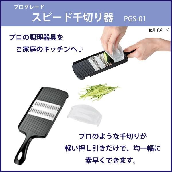 | 本格調理シリーズ、プログレードです。特殊形状のクランク刃。プロのような千切りができます。軽い押し引きだけで均一幅の千切りが素早くできます。 |