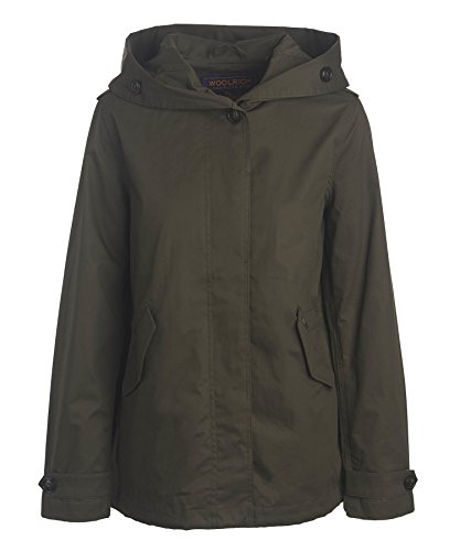 Woolrich - Classic styling and a high-tech performance fabric team up in a shorter 26 1/2" length rain jacket, perfect for the unpredictable weather of early spring and summer. Made of 100% cotton with a water-resistant Dupont Teflon finish, then lined with a muted cotton buffalo check. Wide attached hood has button accents; front closure has one visible button, plus three additional buttons behind a hidden storm placket. Invisible waist tunnel with an adjustable draw cord; bottom hem has an adjustable draw cord with a snap closure. Slanted front pockets with snap closures; adjustable button-tab sleeves.Feature